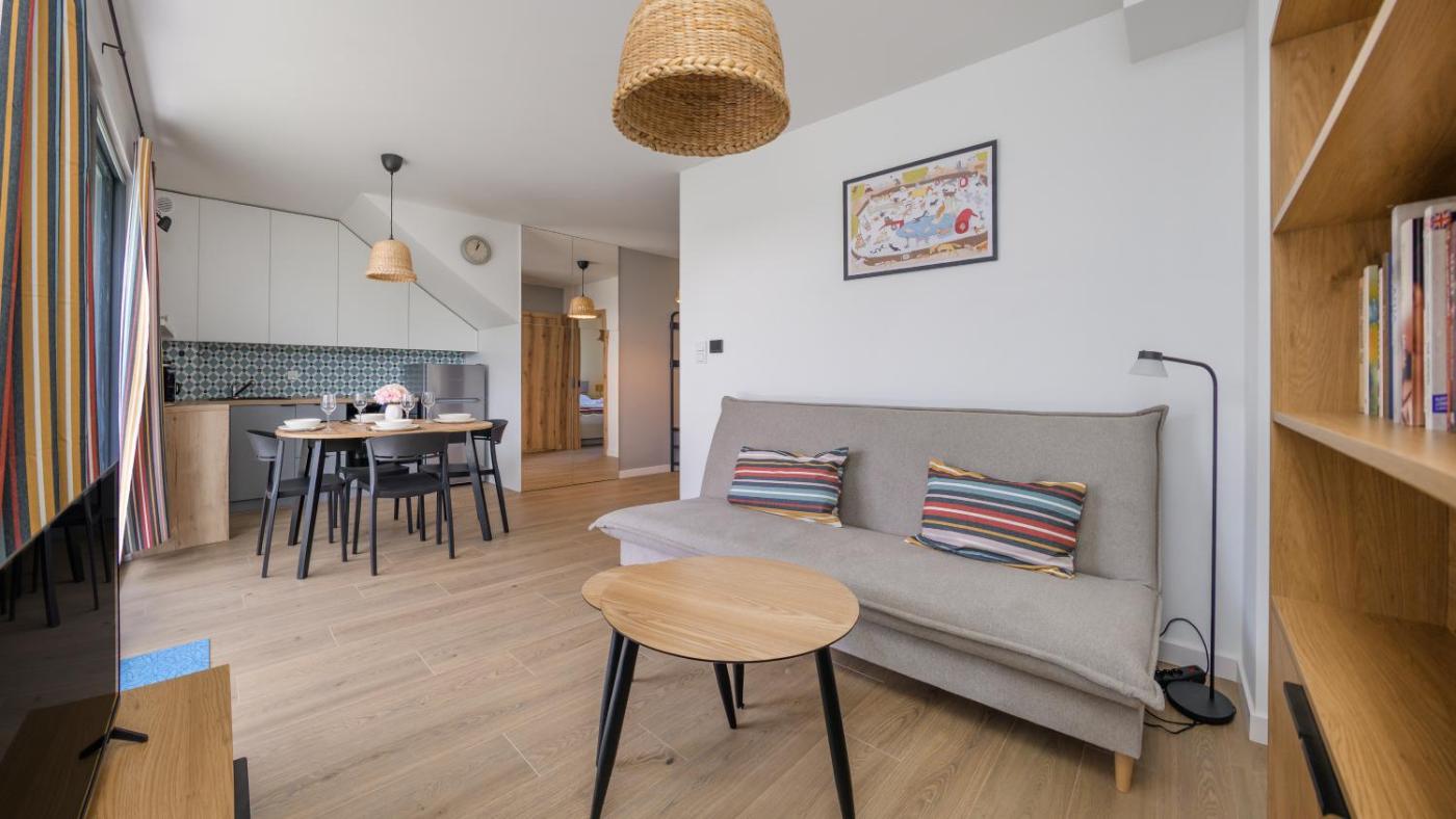 Oferta apartamentu obejmuje sypialnię (1), salon, aneks kuchenny z pełnym wyposażeniem, w tym lodówką i ekspresem do kawy, a także łazienkę (1) z prysznicem oraz suszarką do włosów. W apartamencie zapewniono ręczniki i pościel.